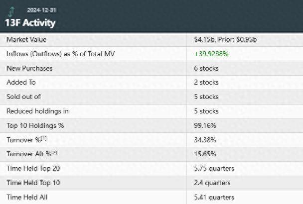 据统计,凯雷第四季度持仓总市值为41.5亿美元,上一季度总市值为9.5亿美元,环比大幅增长近40%。凯雷在第四季度的美股投资组合中新增6只个股,增持了2只个股,减持了5只个股,清仓5只个股。其中前十大持仓标的占总市值的99.16%。